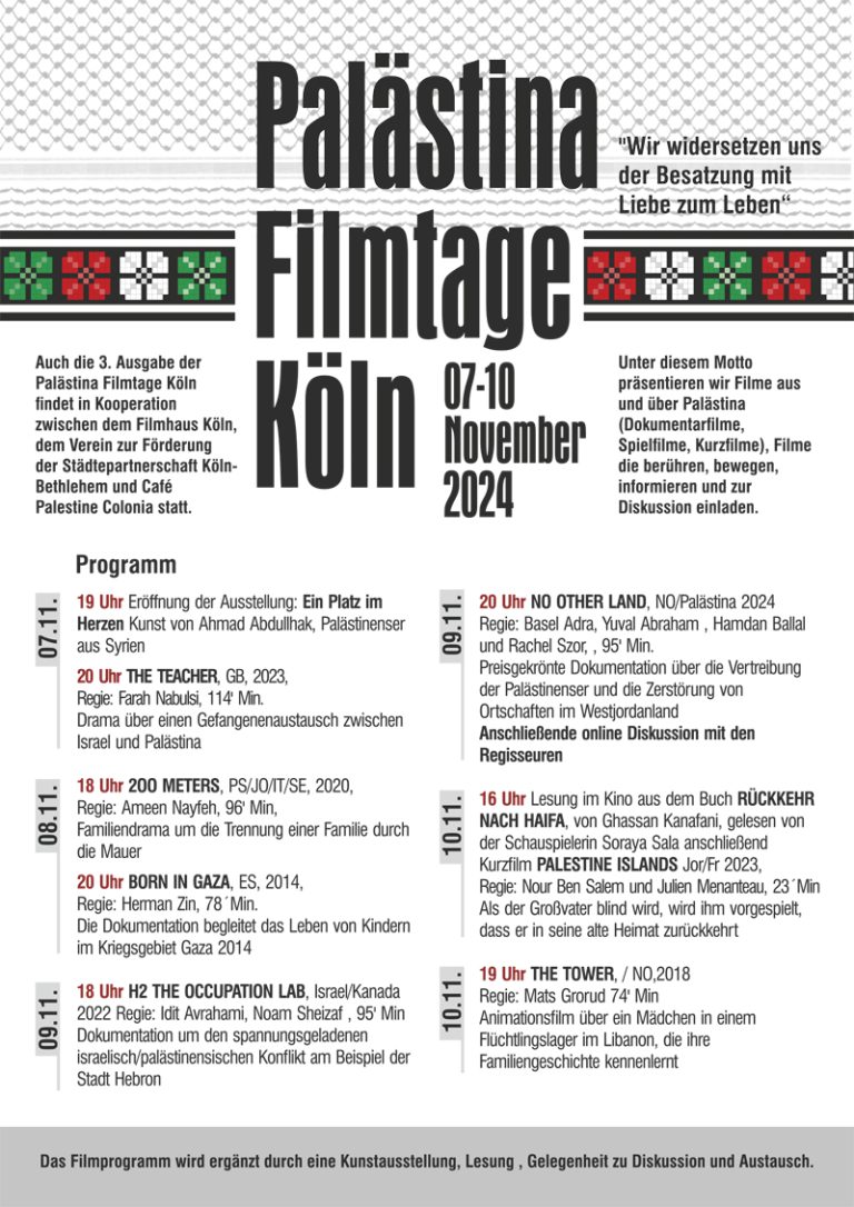 Kunstausstellung und Diskussion. In Kooperation von Filmhaus Köln, Städtepartnerschaftsverein Köln-Bethlehem und Café Palestine Colonia.